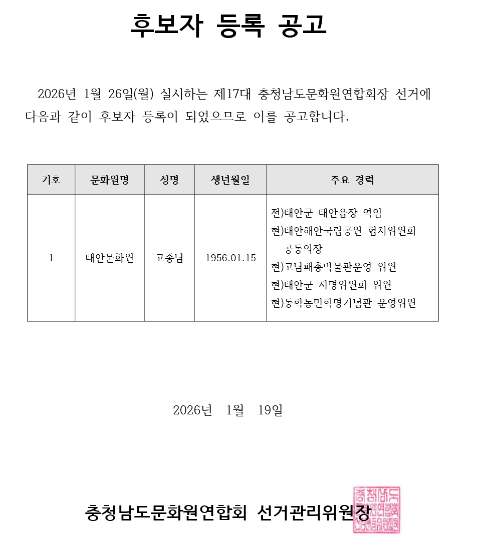 제17대 충청남도문화원연합회 회장선거 후보자등록결과 및 공고